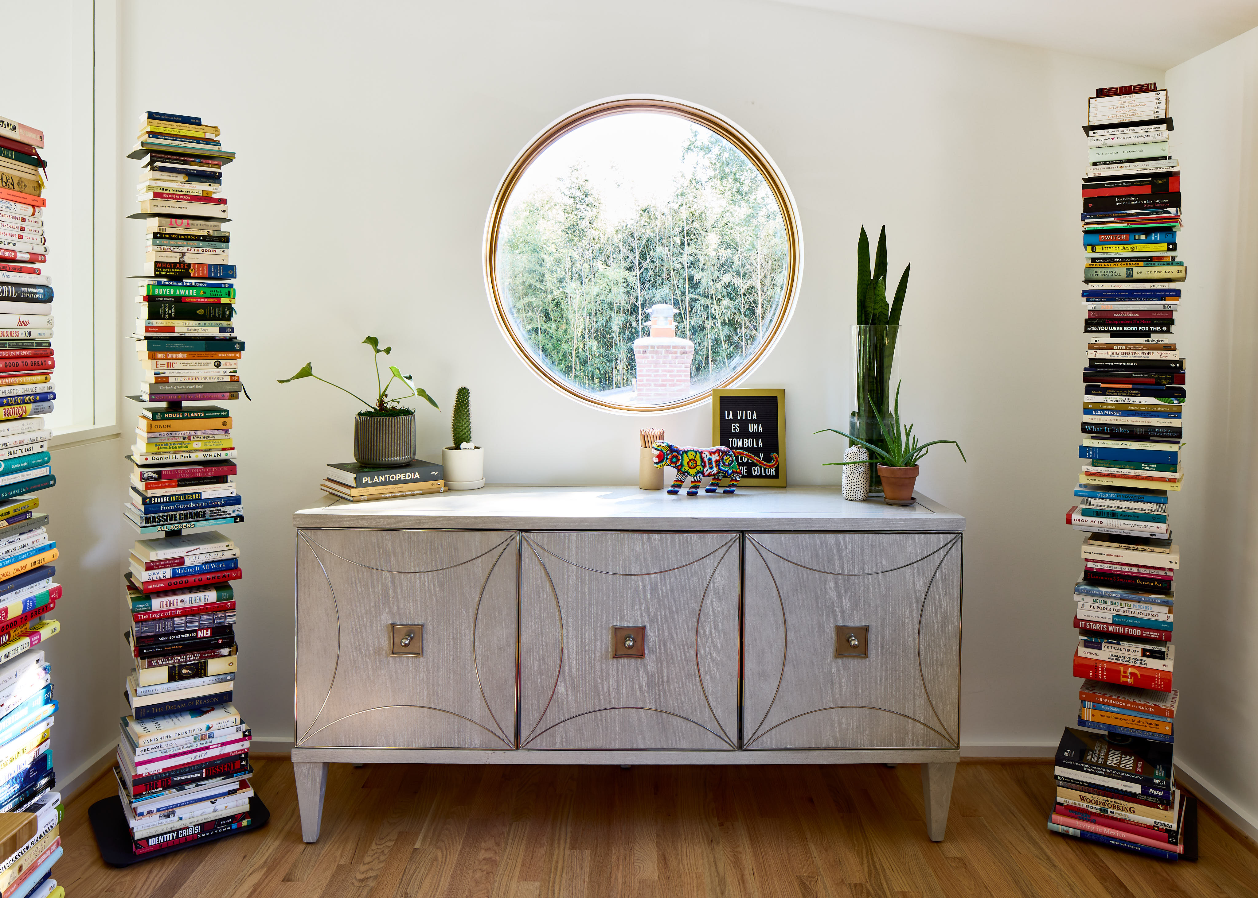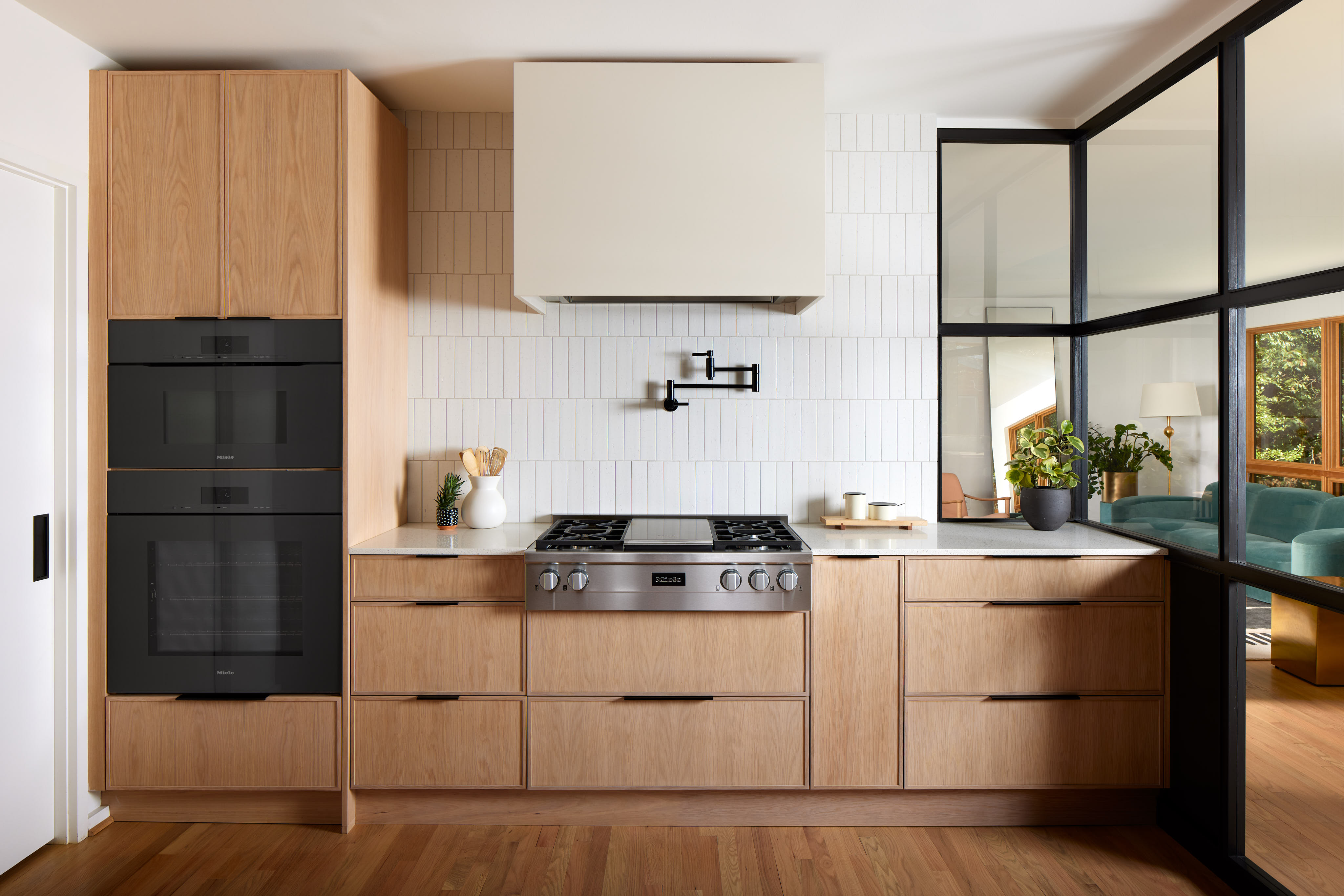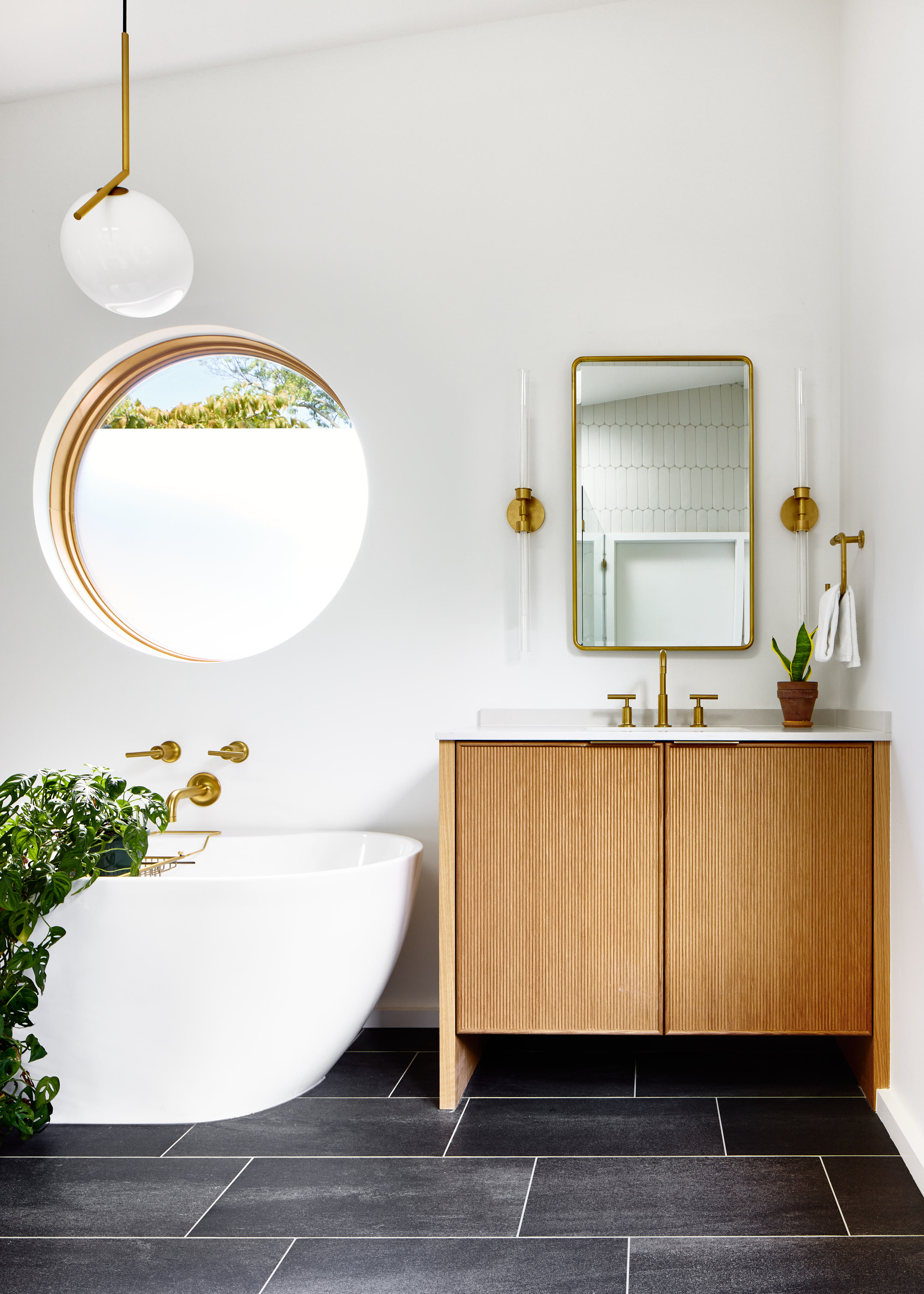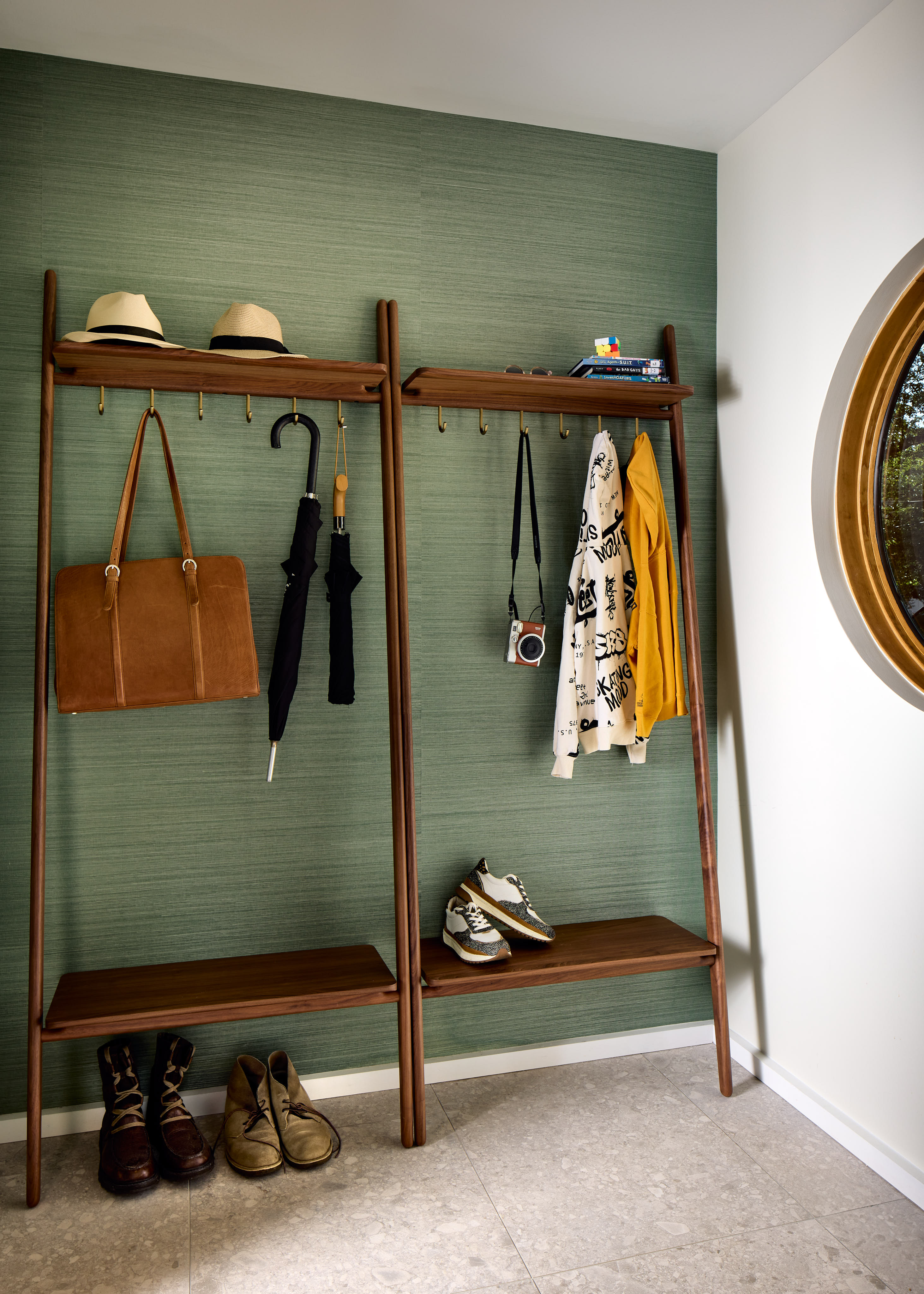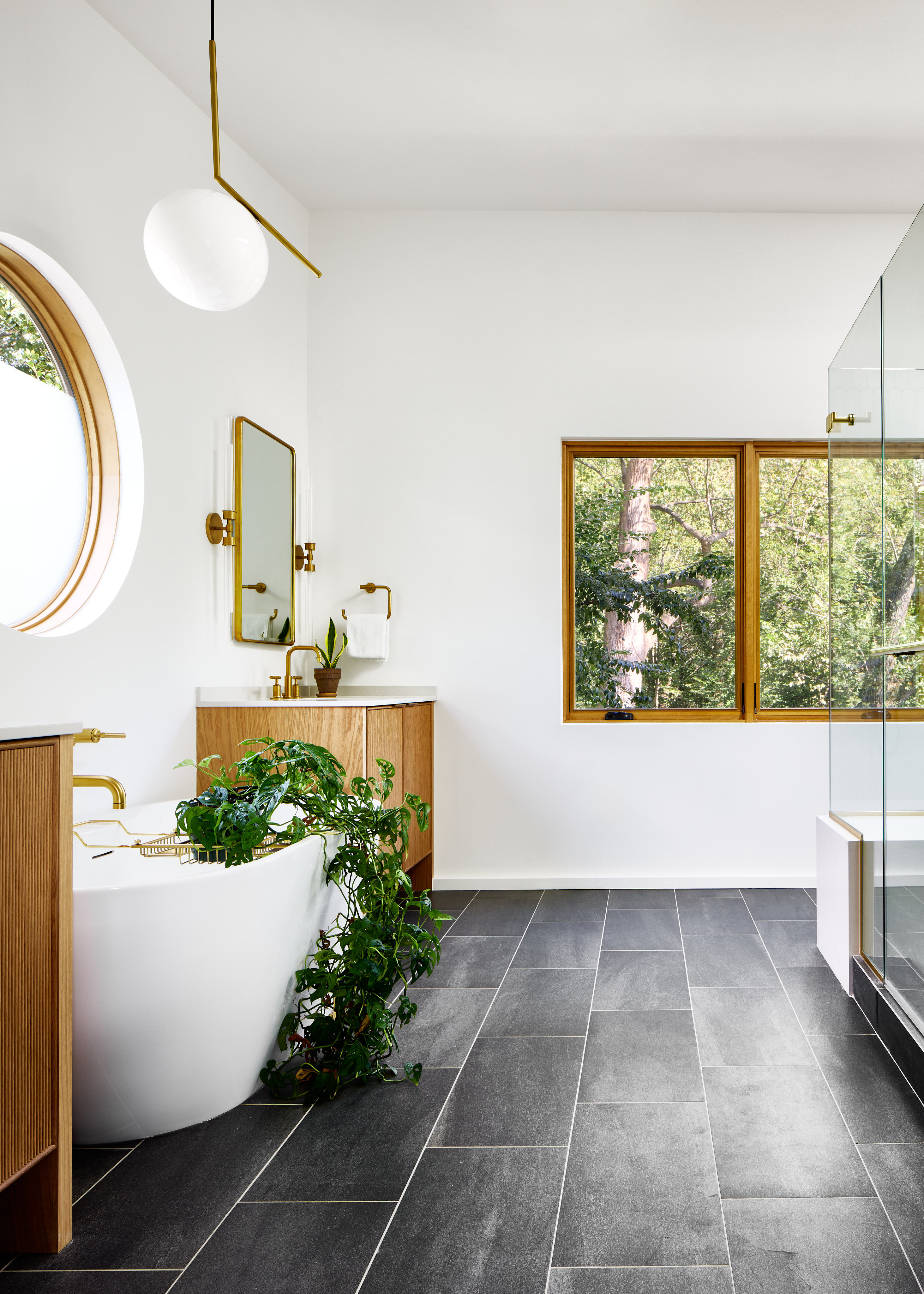 Our clients wanted a crisp modern look, but one that also embraced the natural materials they wanted to invite inside. In the kitchen, clean sliding glass panel doors create a physical enclosure that lets through all the light from the rear windows. A two-tone, white oak and macadamia cabinet scheme cleaves to the neutral palette. A textured fern wallpaper in the mudroom brings a pleasing character to the small room, and is duplicated as an accent wall in the main suite upstairs. More windows line the back wall of the bedroom, looking out to the forest, and a skylight in the adjoining main bathroom washes the space with sunlight. Round porthole-style windows throughout the home add to the sense of peering out into a hidden, sun-dappled world.