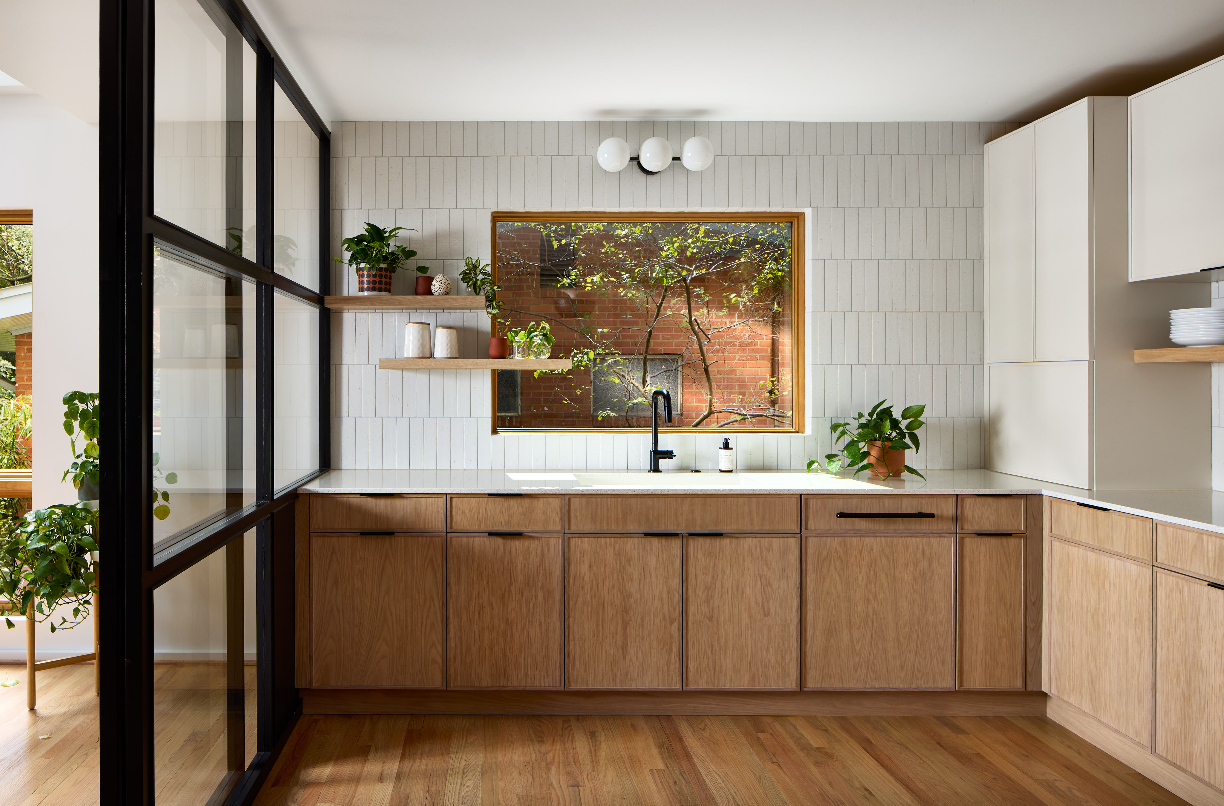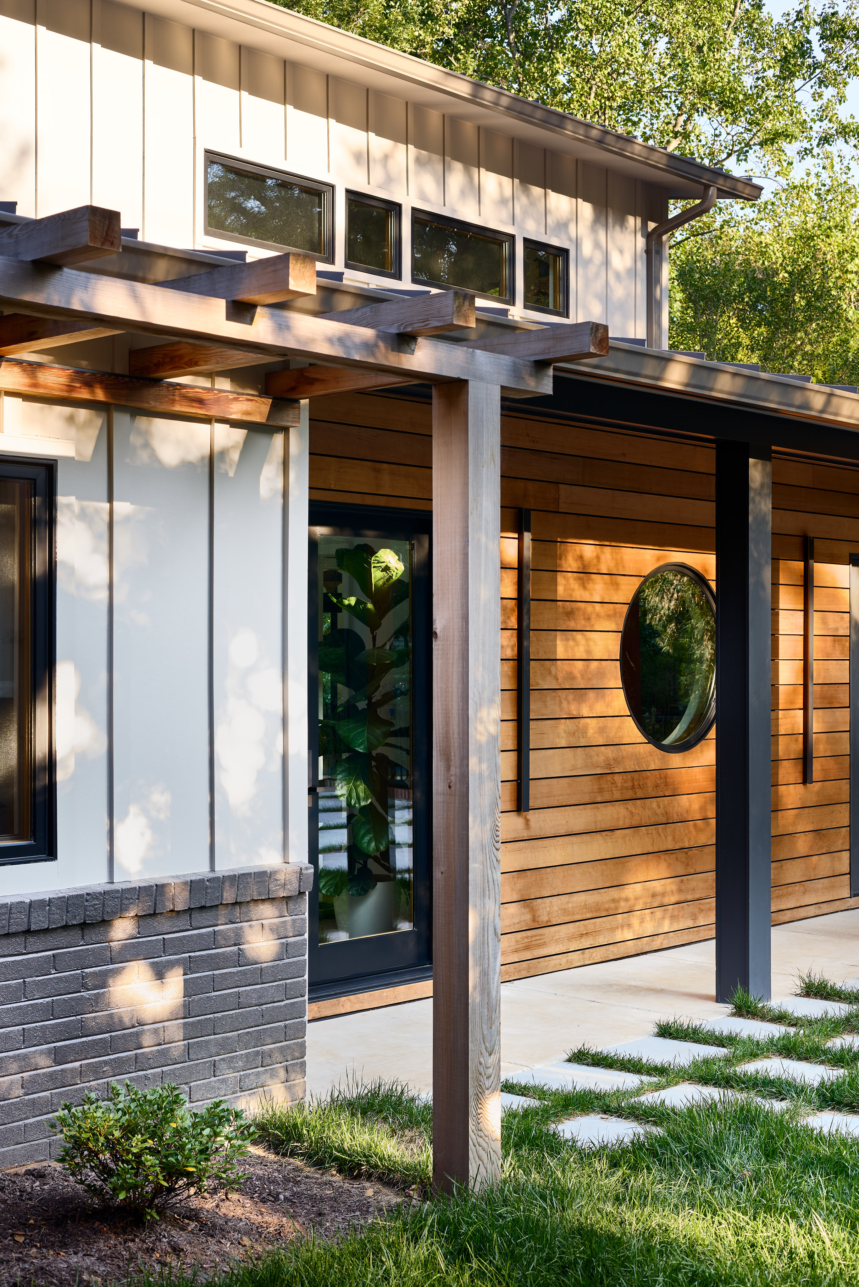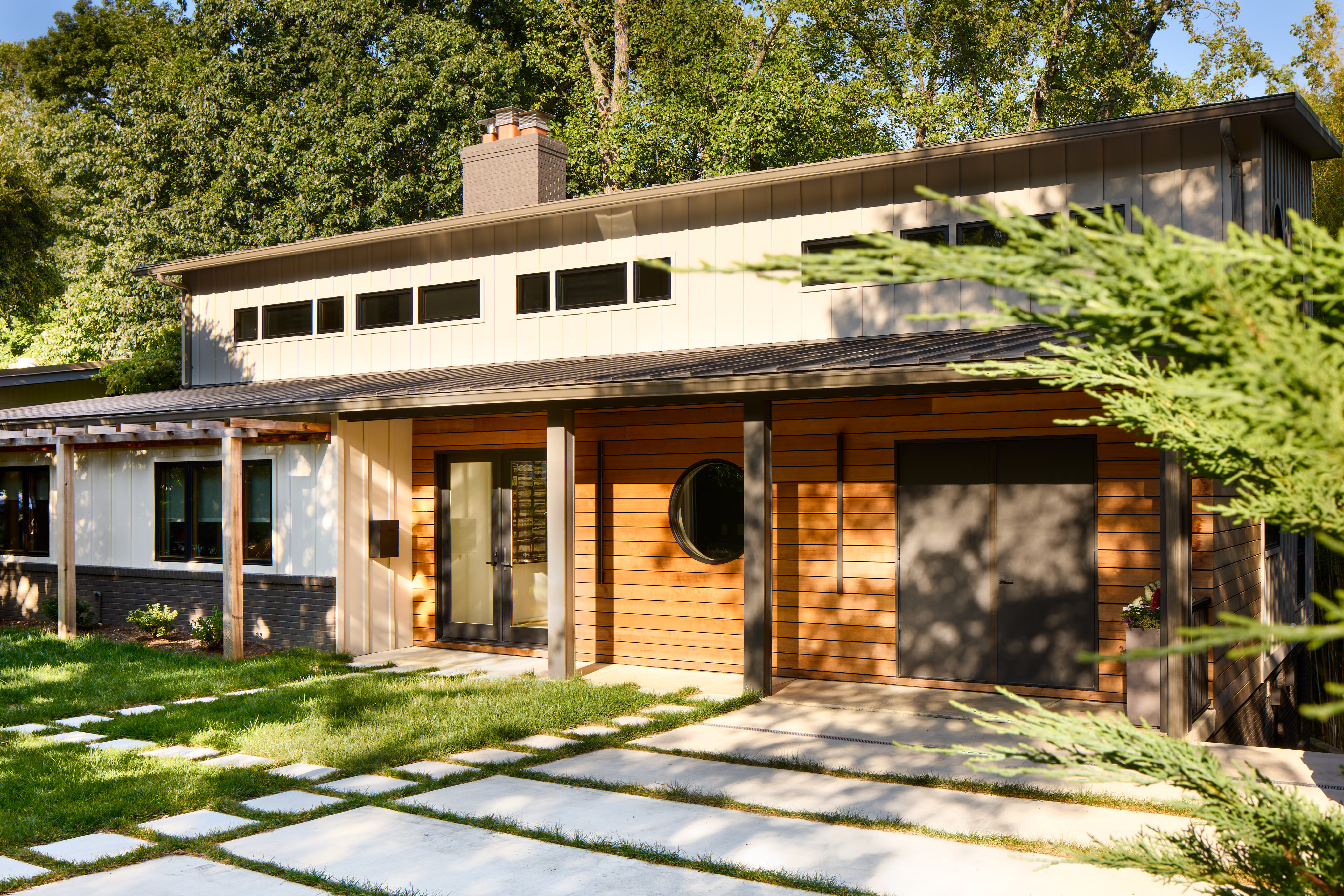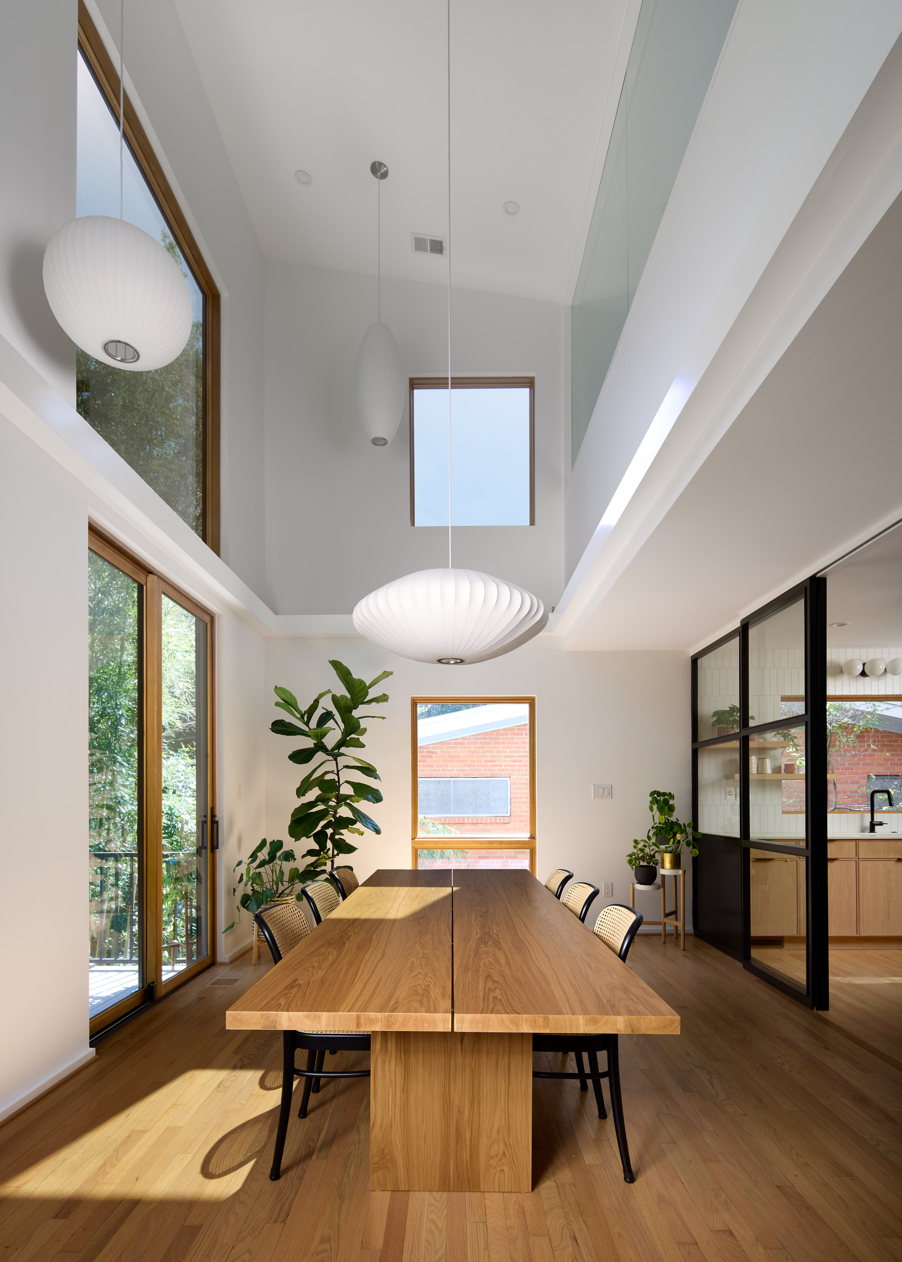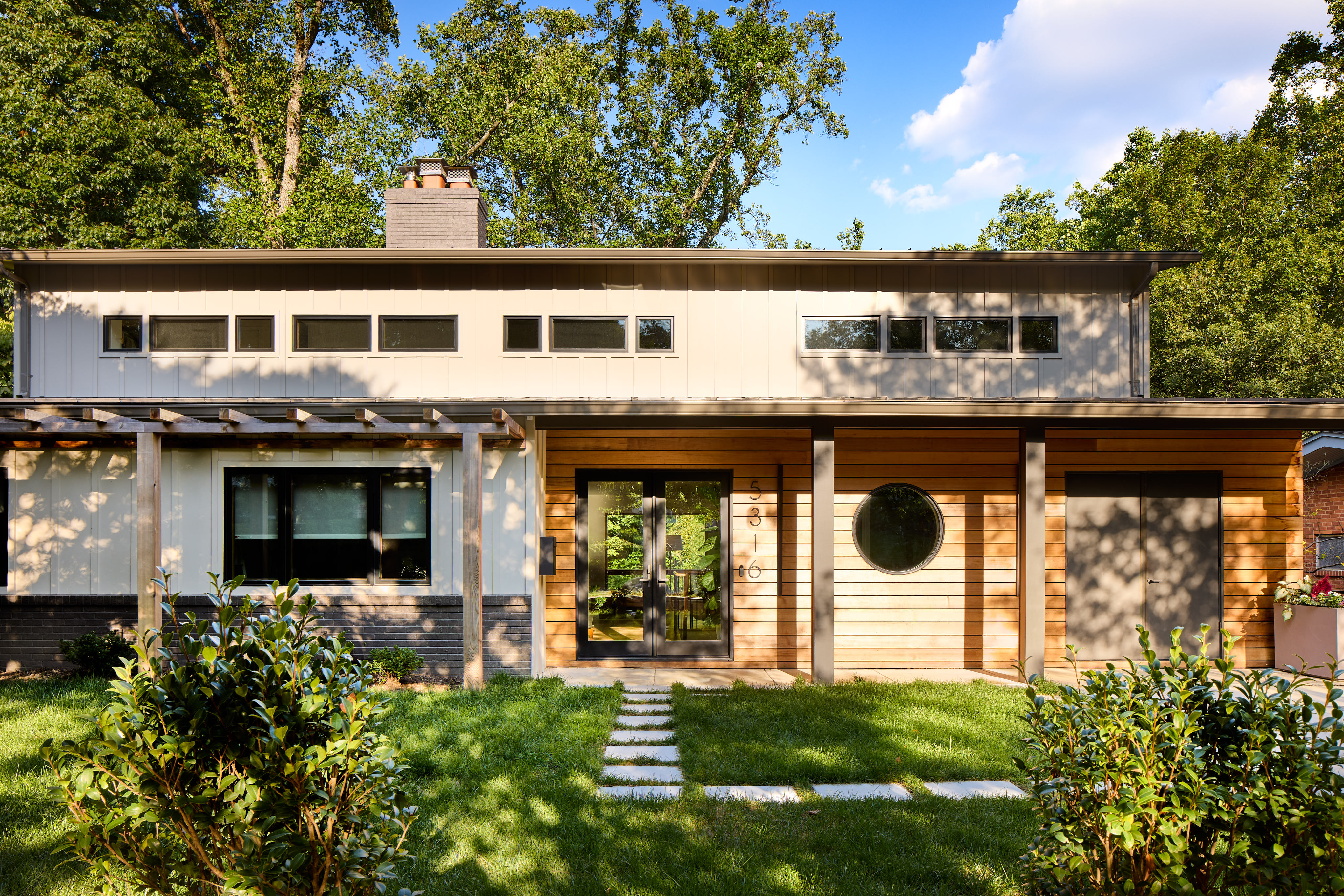 Our clients are working professionals in the DC area with two young children. They wanted to remodel their existing one-story with a walk-out basement into a two-story home with a primary suite upstairs, a much larger kitchen and dining area for entertaining, and an in-law suite downstairs. Of particular interest was creating the feeling of a serene natural getaway, far from the hustle and bustle of the city. The homeowners’ well-maintained collection of houseplants feel right at home in this top-to-bottom remodel filled with natural tones and minimally processed finishes, with tall windows looking out to terraced landscaping leading to the forested creek behind the house.