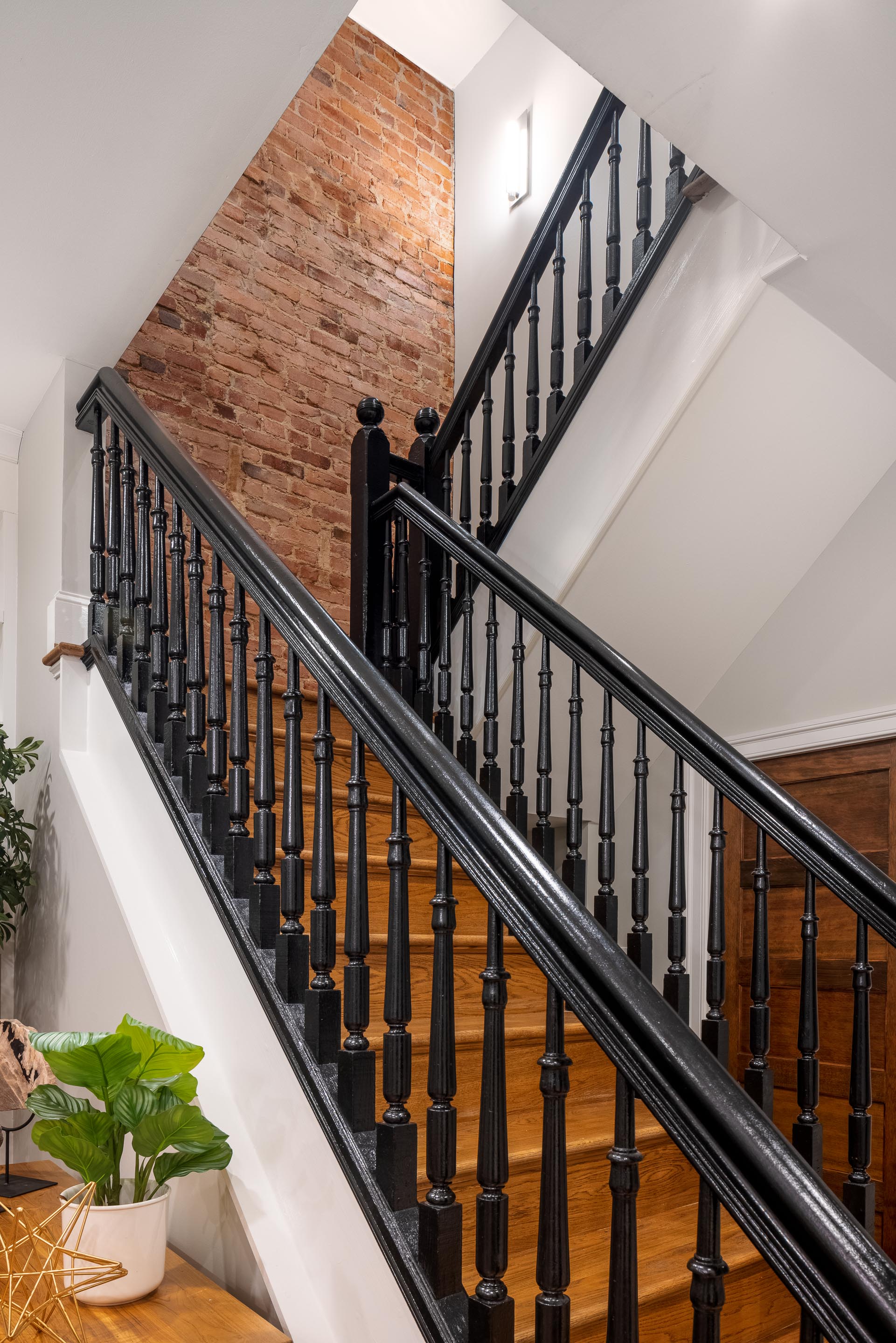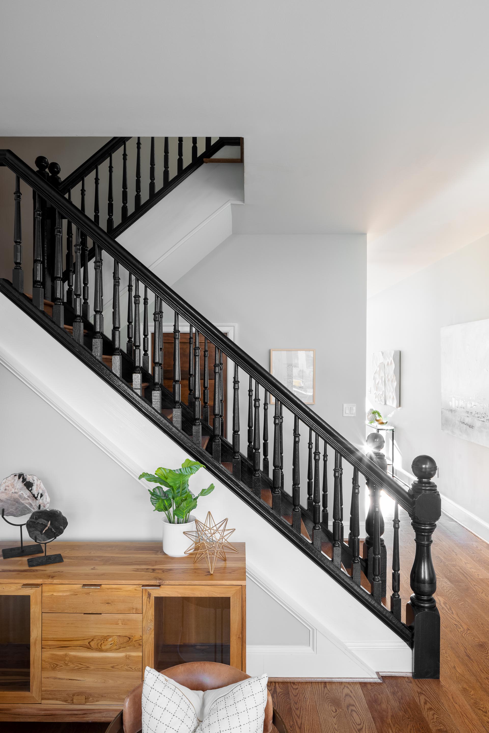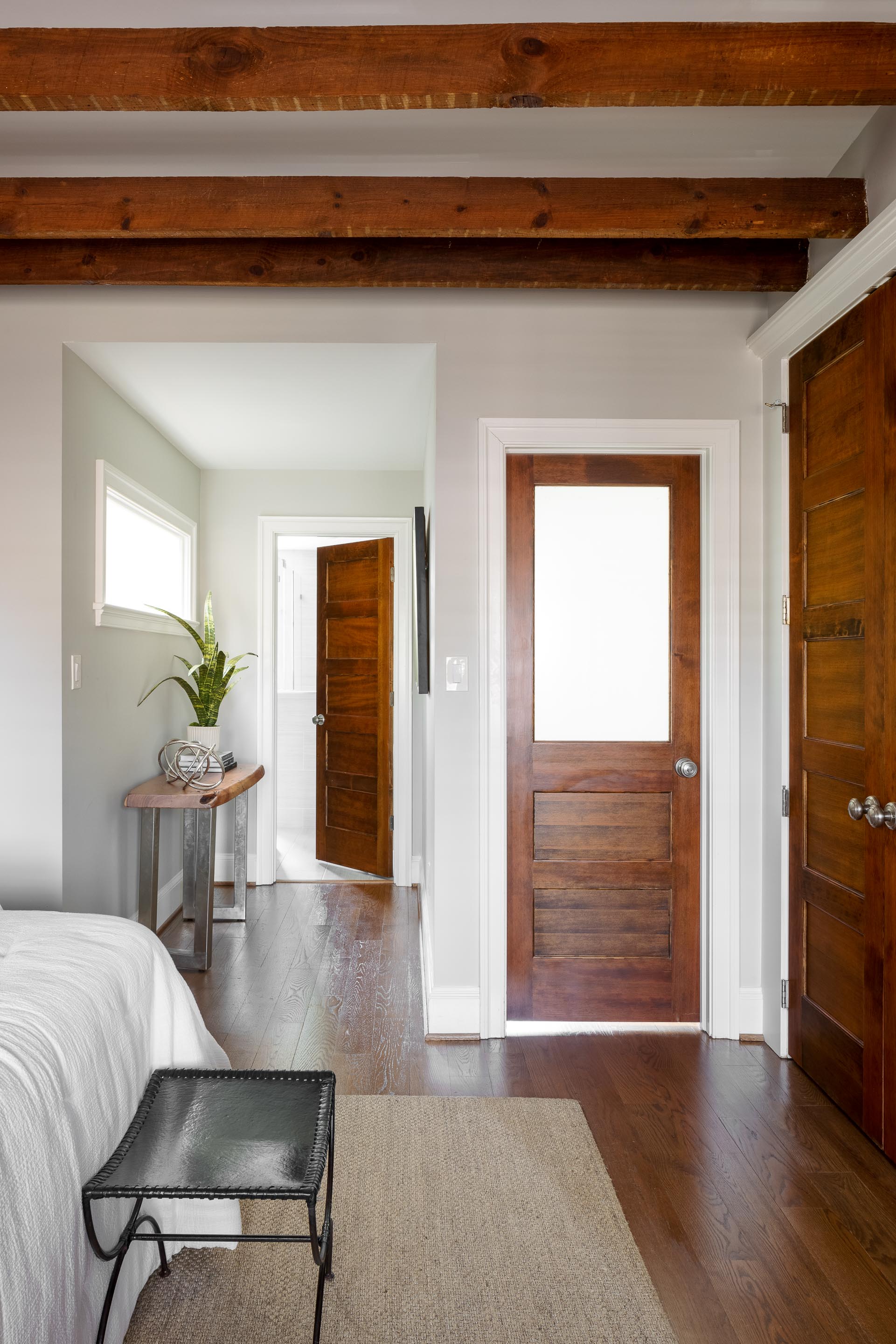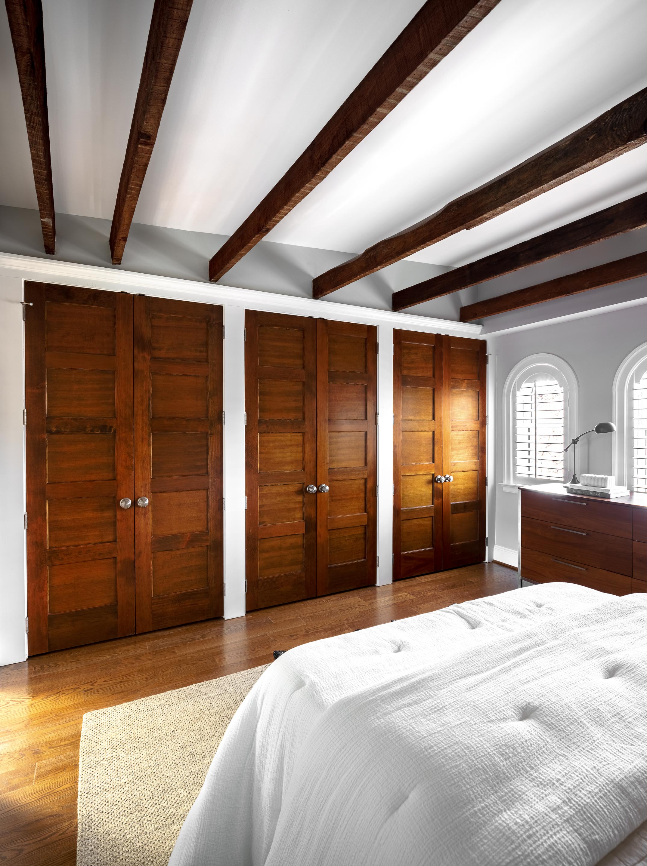 With the original staircase bisecting the main floor, we wanted to create a sense of connectedness between the kitchen in the rear and the living room up front. We made sure to preserve the tall windows in the front, and add plenty of windows and a glass door with a transom window in the kitchen, to allow light to pass all the way through. The exposed brick on the staircase headed upstairs serves as a reminder of the house’s age and history, while vintage exposed beams and closet doors provide the same function in the primary suite upstairs. In order to achieve this look with the exposed structural beams, we brought the ceiling line up to the roof, eliminating what had been a small insulated crawl space, and leaving the original wood on full display.