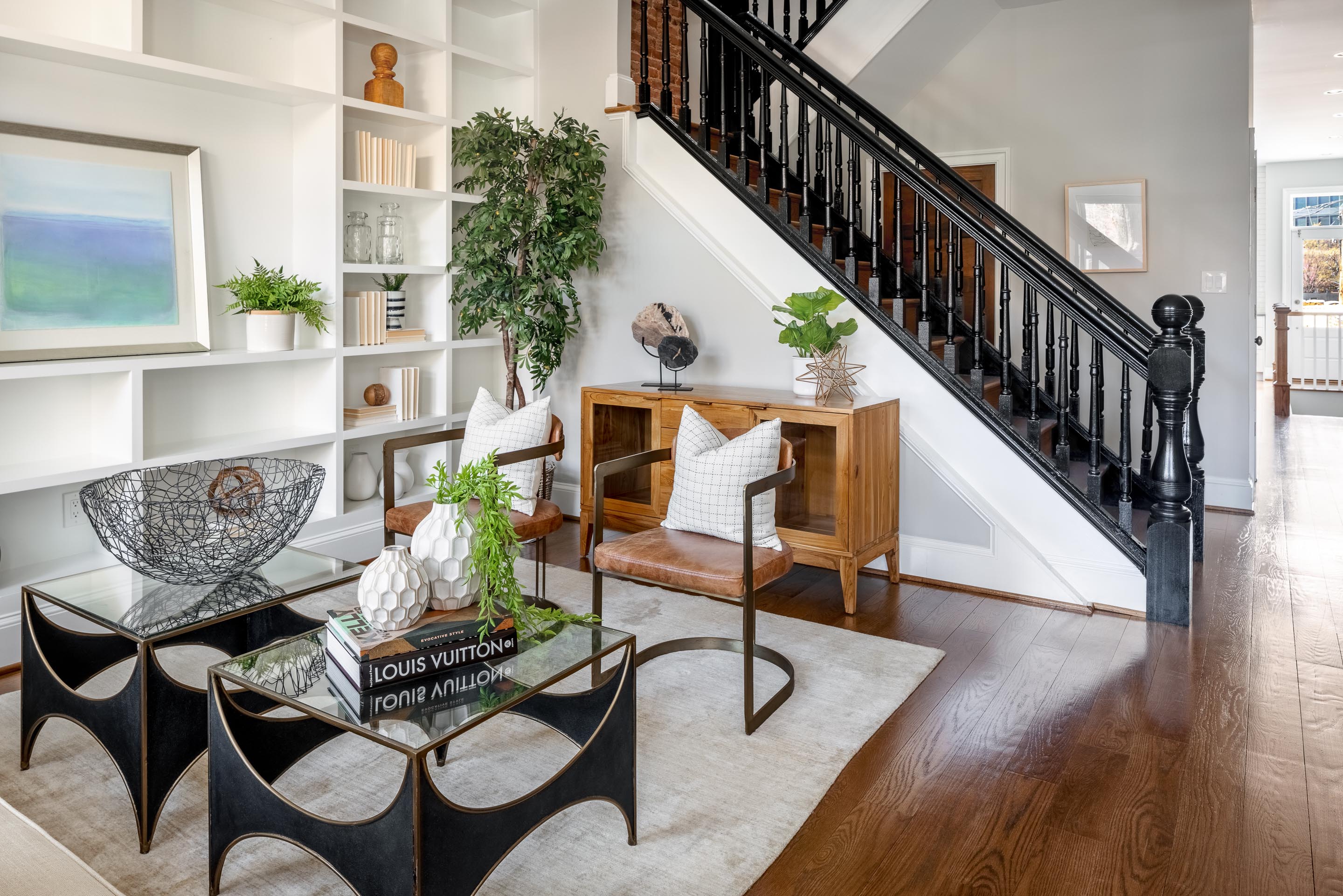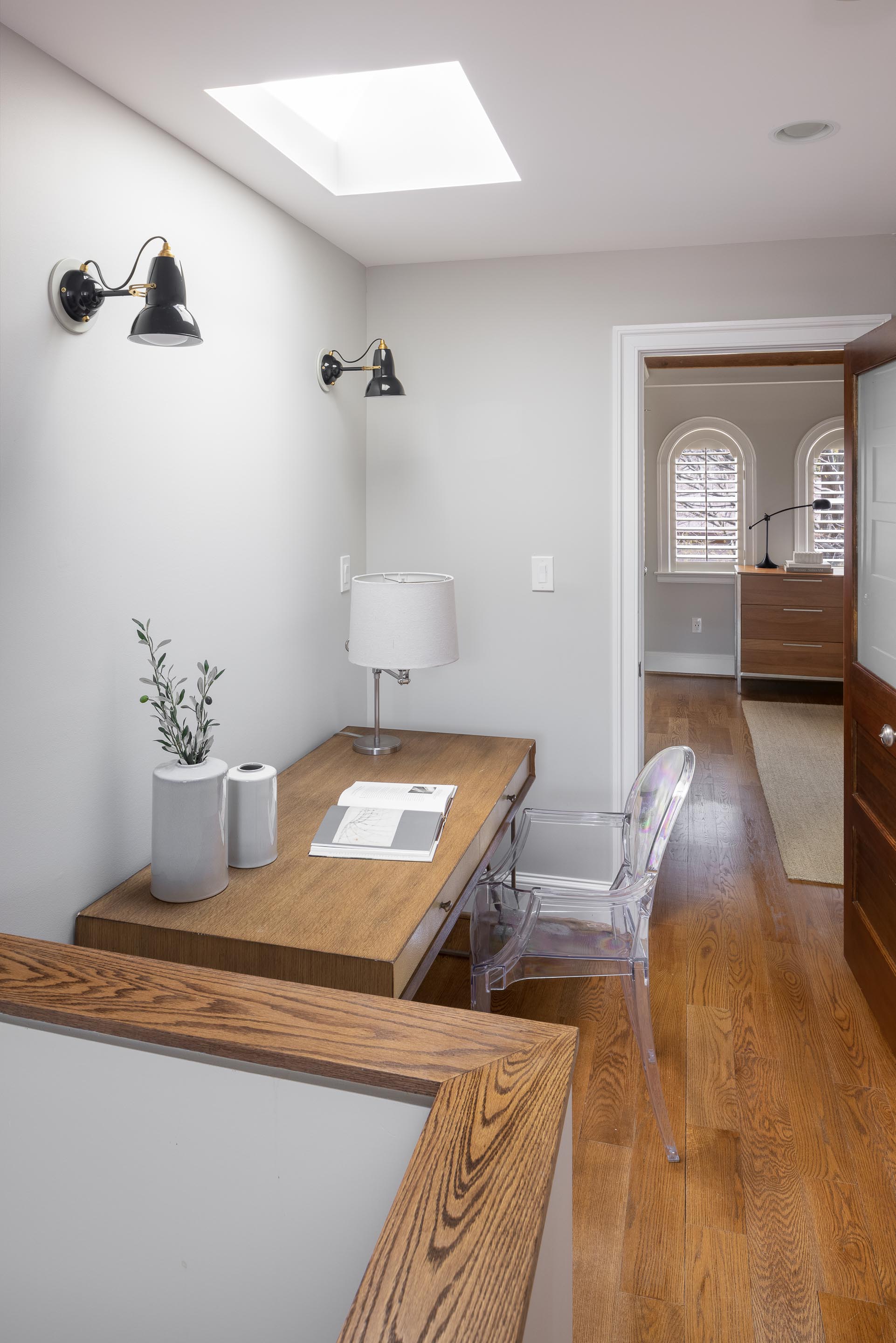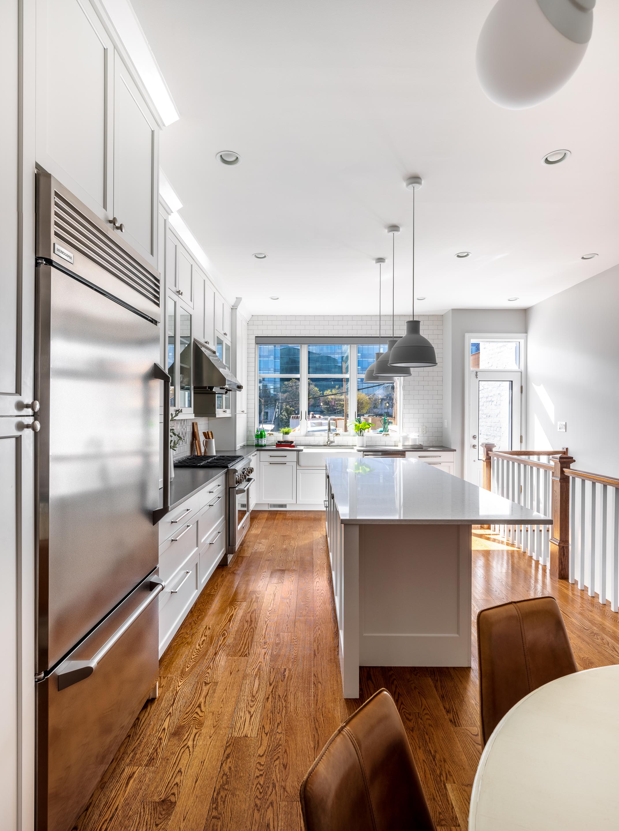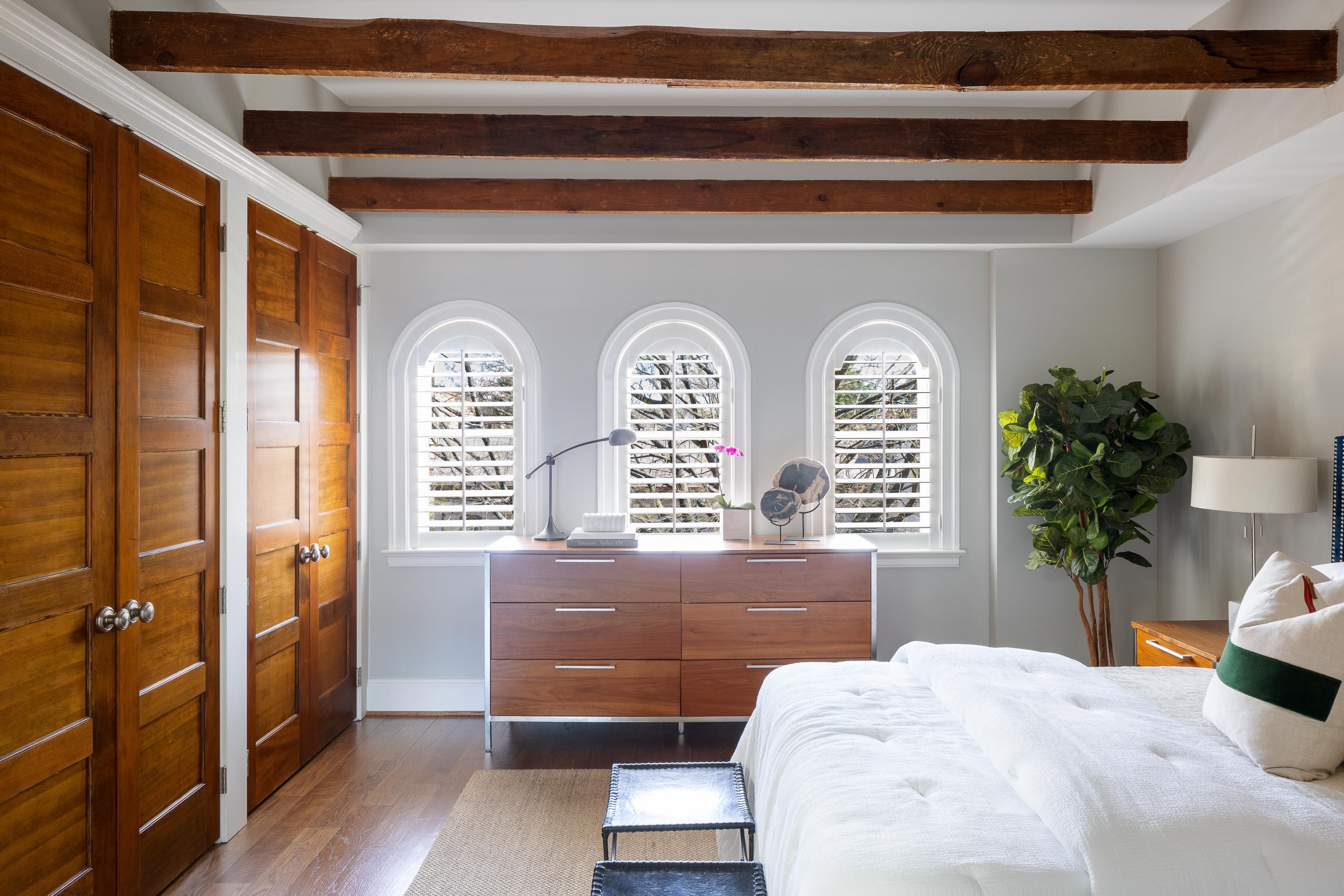 With the original staircase bisecting the main floor, we wanted to create a sense of connectedness between the kitchen in the rear and the living room up front. We made sure to preserve the tall windows in the front, and add plenty of windows and a glass door with a transom window in the kitchen, to allow light to pass all the way through. The exposed brick on the staircase headed upstairs serves as a reminder of the house’s age and history, while vintage exposed beams and closet doors provide the same function in the primary suite upstairs. In order to achieve this look with the exposed structural beams, we brought the ceiling line up to the roof, eliminating what had been a small insulated crawl space, and leaving the original wood on full display.