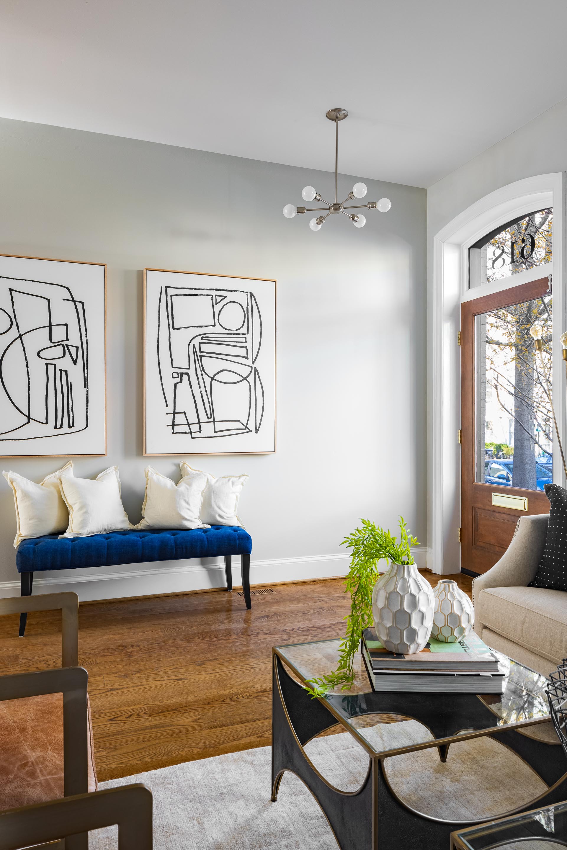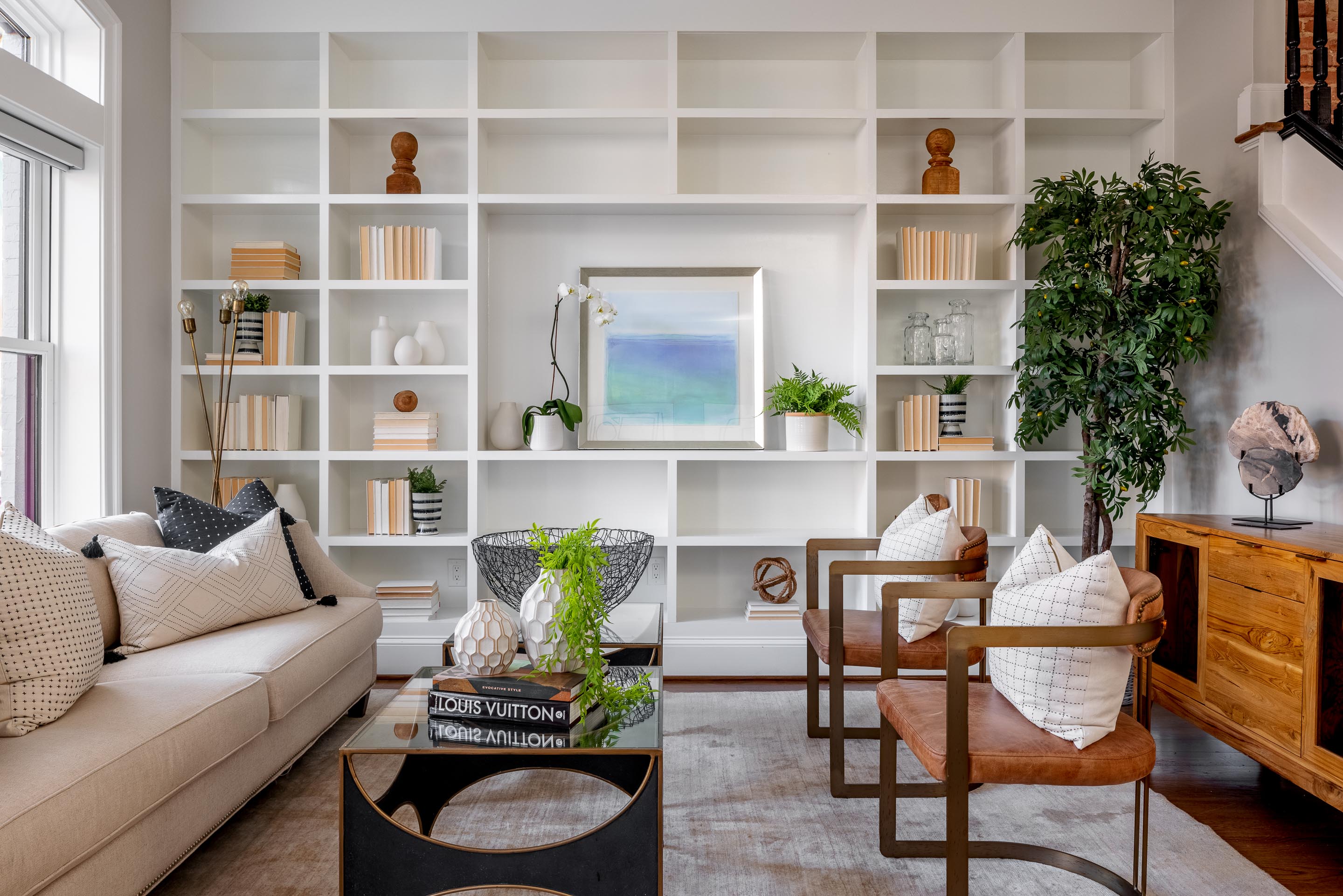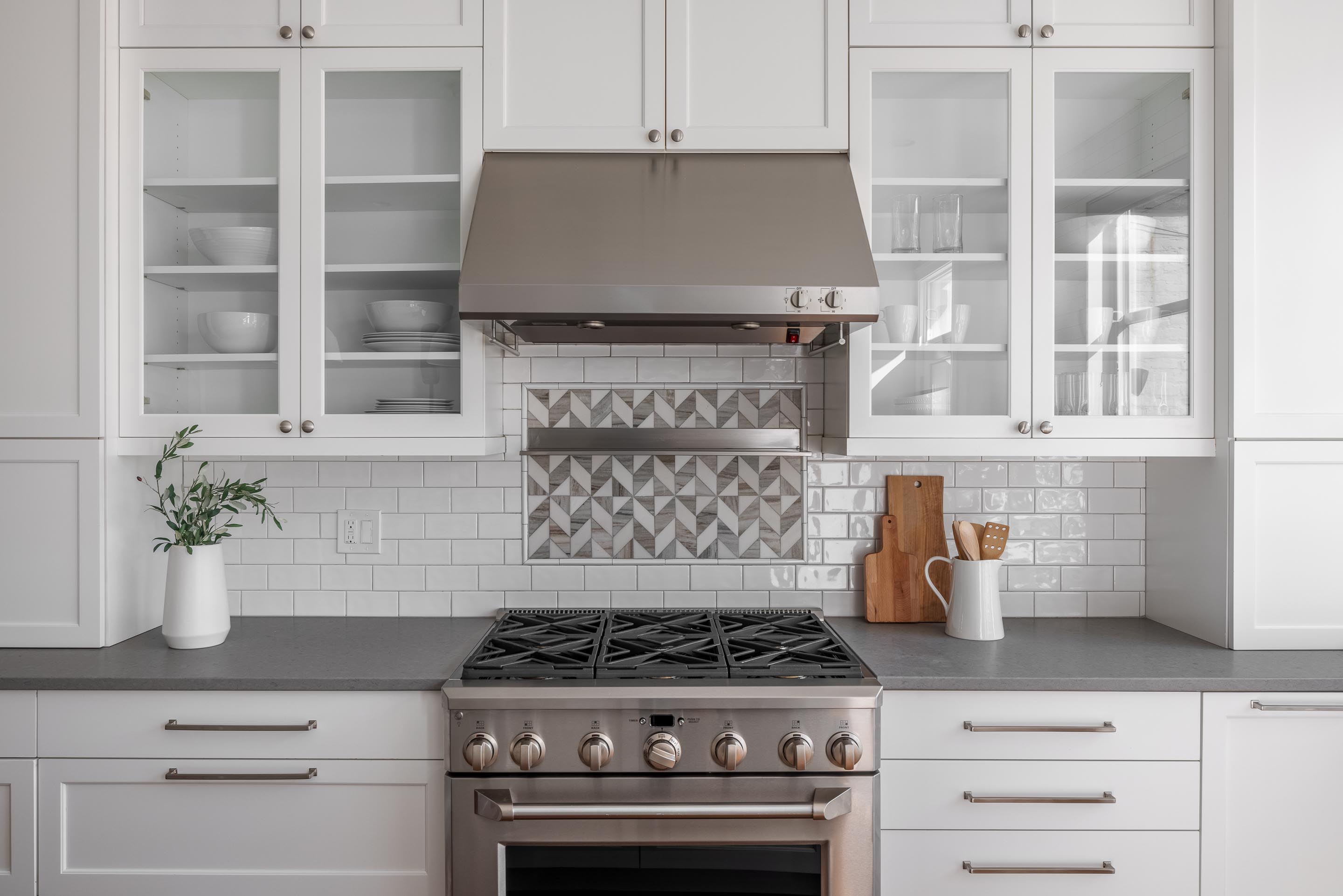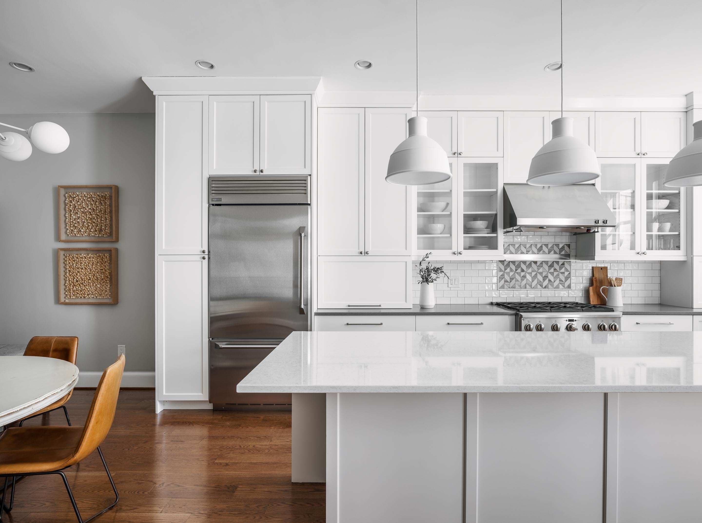 With the original staircase bisecting the main floor, we wanted to create a sense of connectedness between the kitchen in the rear and the living room up front. We made sure to preserve the tall windows in the front, and add plenty of windows and a glass door with a transom window in the kitchen, to allow light to pass all the way through. The exposed brick on the staircase headed upstairs serves as a reminder of the house’s age and history, while vintage exposed beams and closet doors provide the same function in the primary suite upstairs. In order to achieve this look with the exposed structural beams, we brought the ceiling line up to the roof, eliminating what had been a small insulated crawl space, and leaving the original wood on full display.