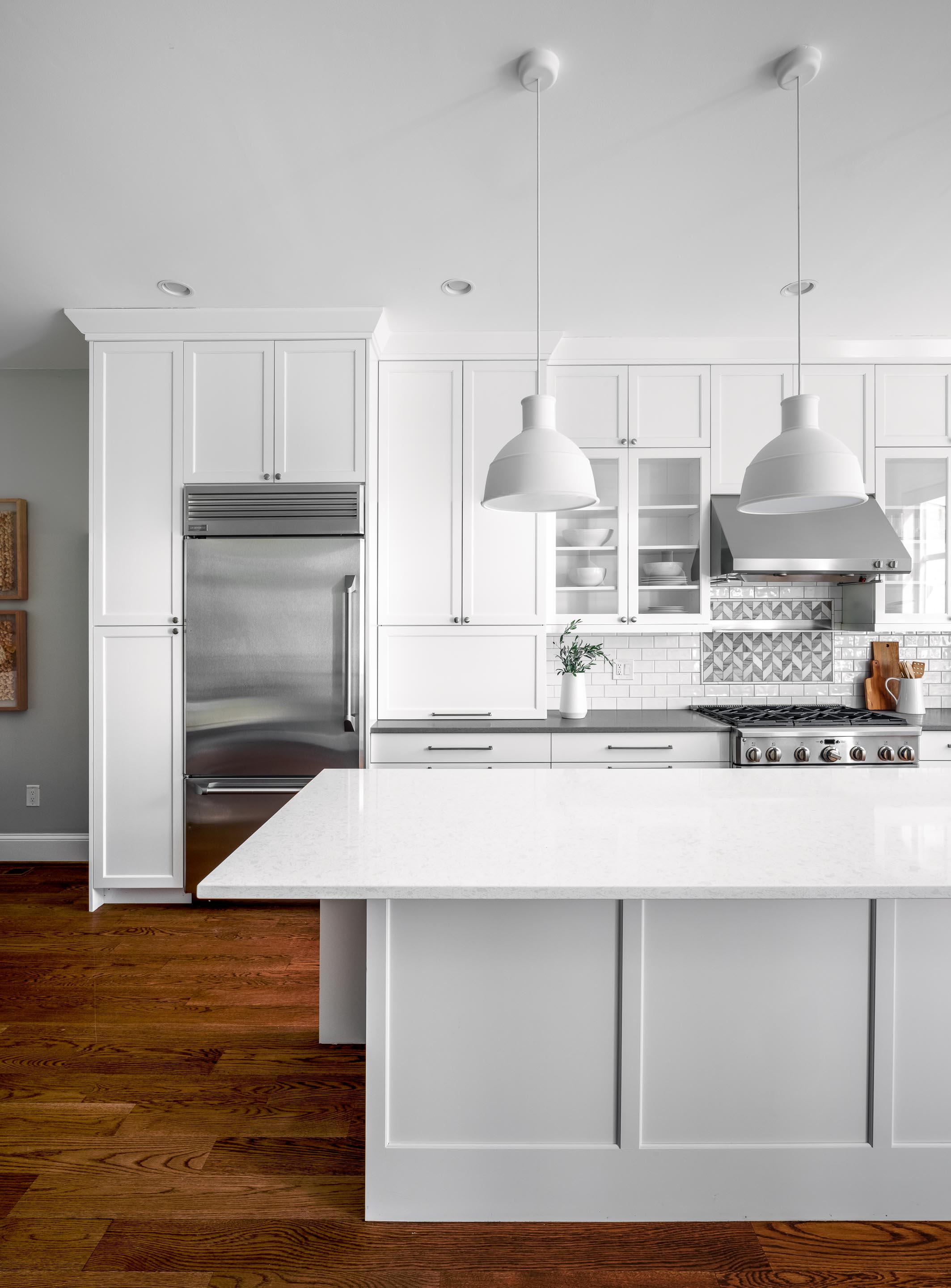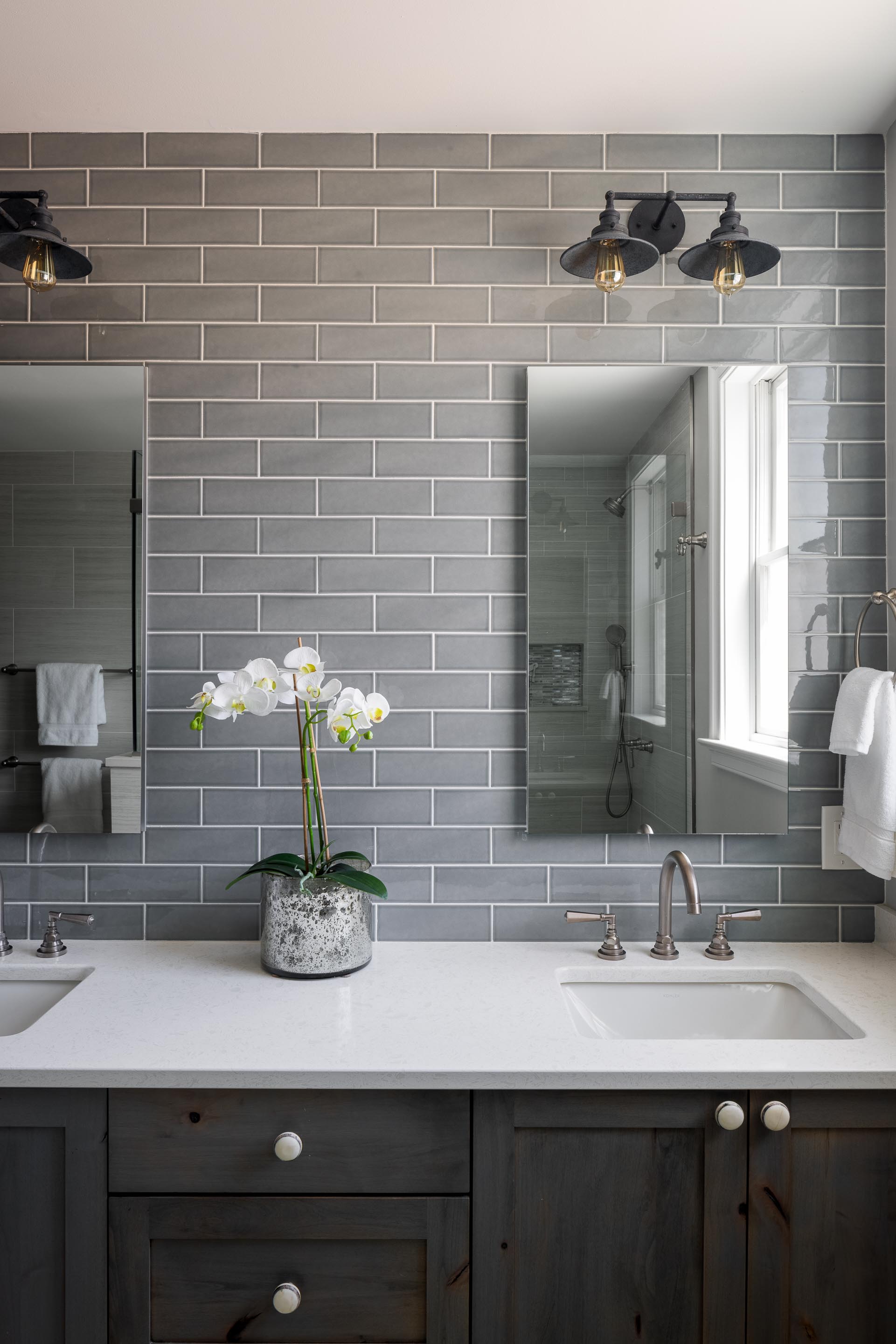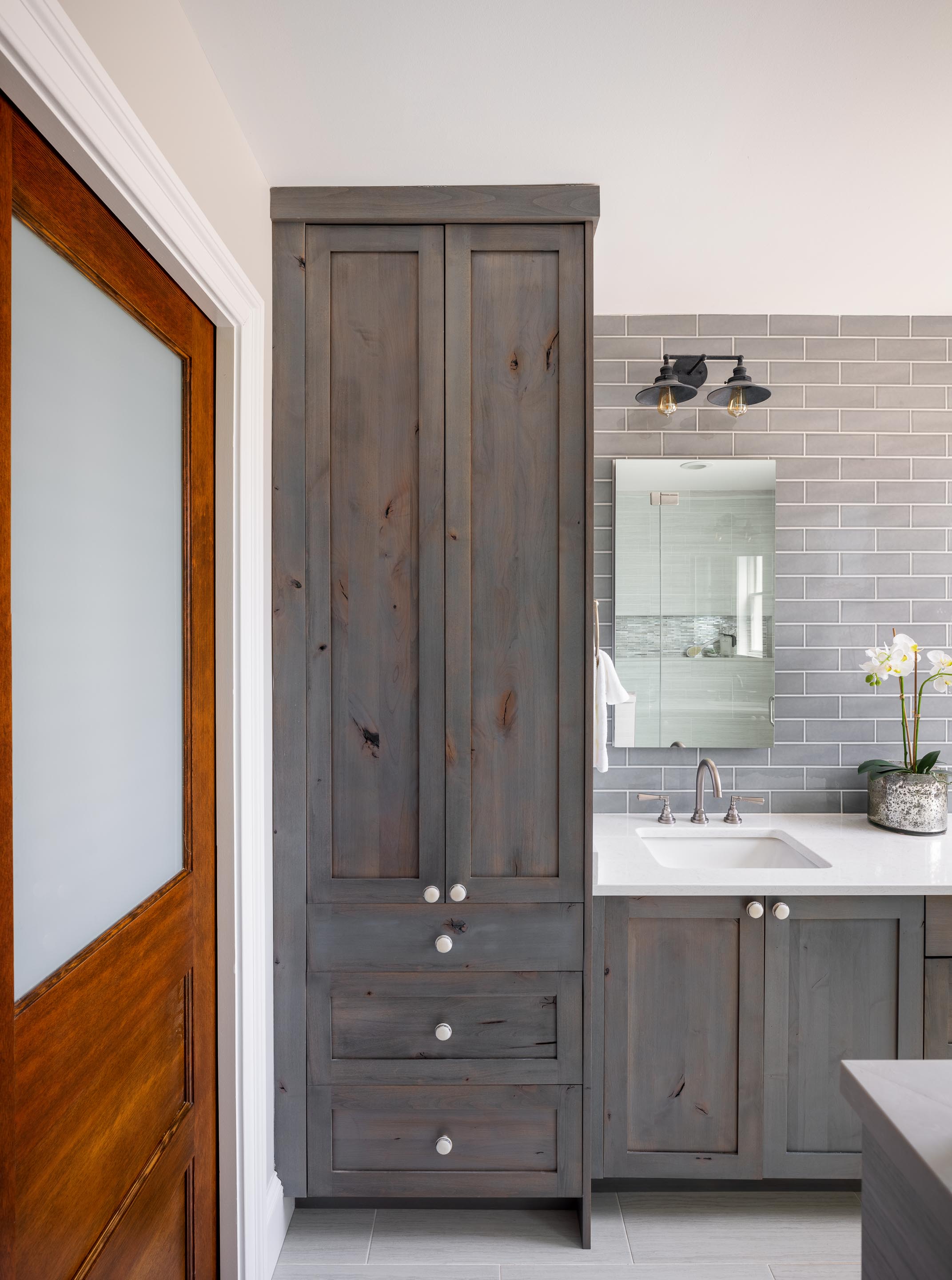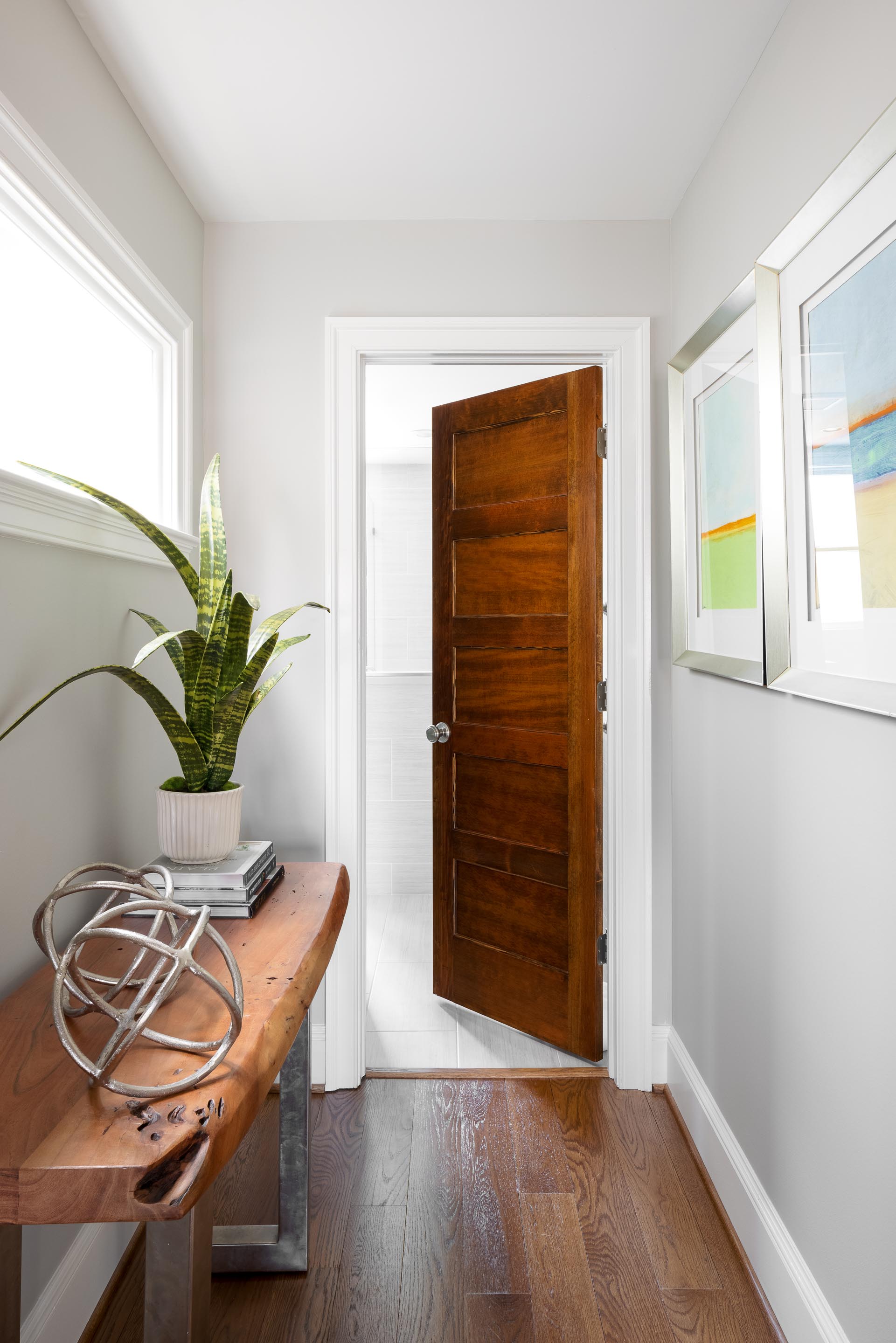Our clients favored a transitional style, with several nods throughout to the home’s original construction. The reclaimed doors and exposed beams of the primary suite are a highlight, but the vintage styling continued into other spaces, evident in the weathered cabinets and vanity of the primary suite, the original stair rail, and the wide-plank red oak flooring. We also left our fair share of modern touches, however, with the angular light fixtures, the crisp lines and refined grayscale of the kitchen, and the decidedly modern farmhouse exterior.
